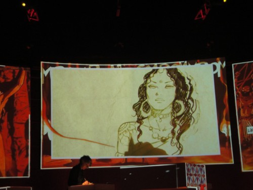 A peine entré, on remarque une célébrité, Romain Hugault , au stand Paquet. Il a déjà terminé sa séance de dédicaces mais il a la gentillesse de me faire un croquis à une vitesse supersonique pour mon tome 1 d’Au delà des nuages .