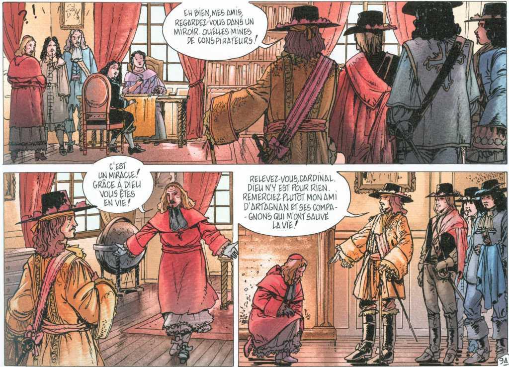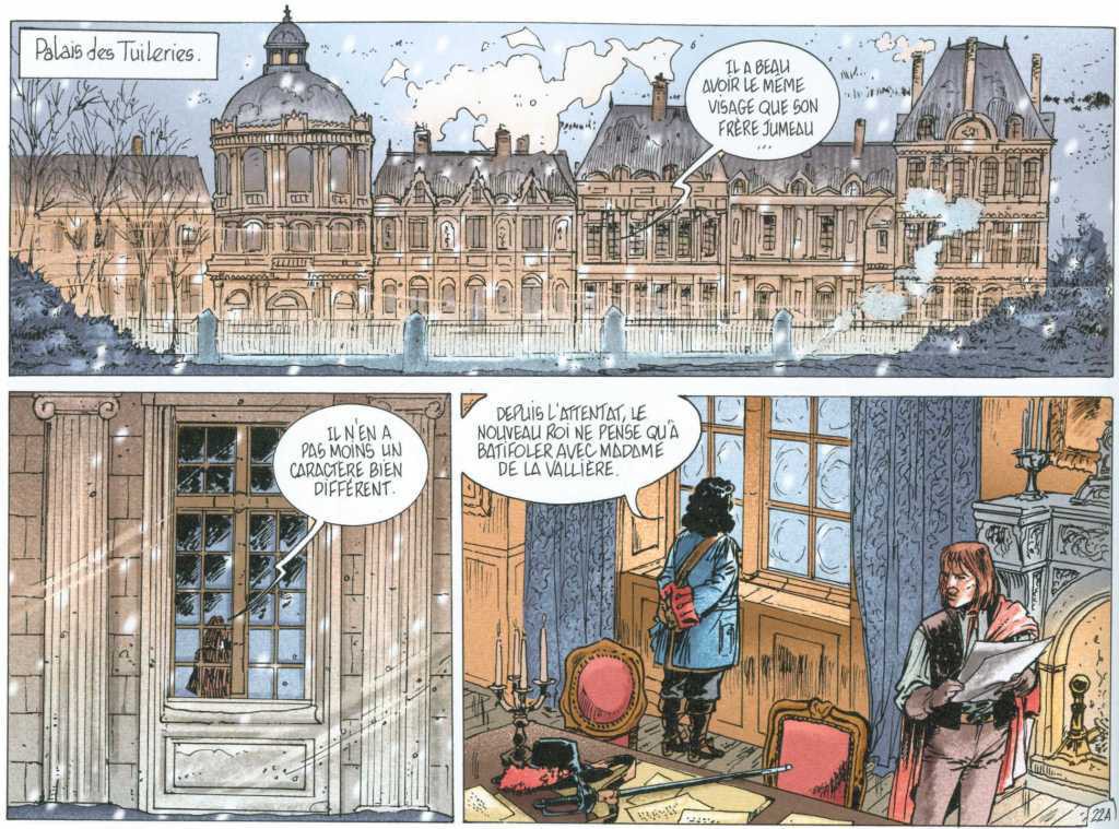 Je vais vous renvoyer à ma chronique des deux premiers tomes sur Samba BD (ICI). Mon développement pour les deux premiers tomes vaut pour le troisième. Je suis toujours séduit par le scénario qui sur base d’un concept de base inventif (le chevalier mécanique) parvient à imbriquer un élément fantastique dans la Grande histoire de France et du Roi Louis XIV. C’est le ressort de la série qui peut-être assimilé aux feuilletons populaires d’antan. Par contre, au niveau du dessin, je n’ai pas remarqué de progression que du contraire. Je retrouve toujours dans le dessin les mêmes faiblesses graphiques. Les personnages sont figés, parfois le dessin manque de détails. La mise au net et les couleurs n’arrangent rien. Je ne m’en cache pas, ce n’est pas trop ma tasse de thé au niveau graphique. J’ai été un déçu sur ce plan.