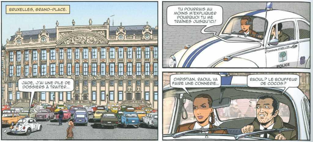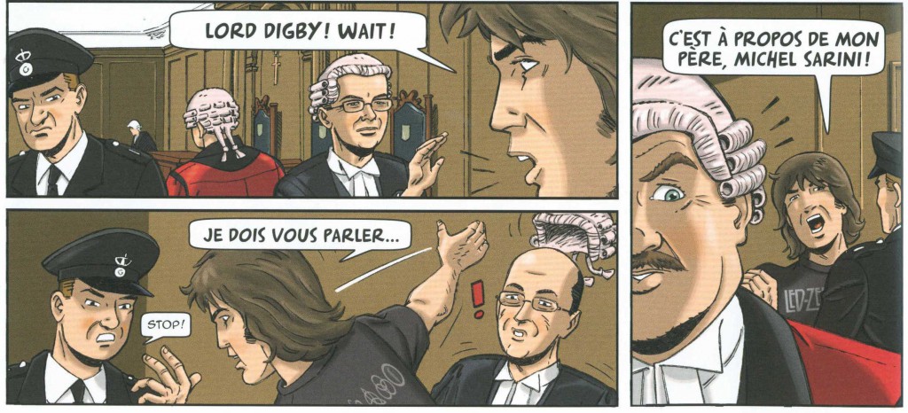 Au niveau graphique, j’ai vraiment bien aimé cette ligne claire agréable avec un soin particulier pour ce qui touche la moto mais aussi les villes visitées par les personnages de ce récit à savoir Londres et Bruxelles. J’ai apprécié également que Baudouin Deville a introduit dans l’histoire des personnages connus et d’autres moins connus. Pour cette deuxième catégorie, ce sont des « private jokes » que seuls quelques connaisseurs peuvent comprendre. Par exemple, page 26, Nicolas Anspach, éditeur de collection belge chez Paquet, a droit à sa caricature et devient un juge anglais affublé d’une perruque de circonstance. J’ai eu l’occasion de rencontrer Nicolas plusieurs fois, cela m’a amusé car je le connais mais le grand public ne le connaît pas nécessairement et va passer à côté comme je suis passé probablement à côté d’autres choses car n’étant pas « initié » .Vous pourrez donc regarder les détails dans les cases, les personnages et retrouver des éléments, des têtes connues comme Benoit Poelvoorde en curé déjanté, Rosy de Palma en concierge espagnole, la reine Fabiola de Belgique et bien d’autres…