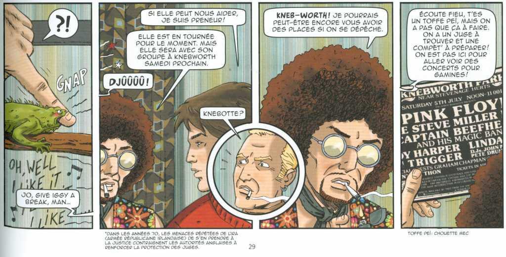 La musique reste en fond avec des références aux Rolling Stones et au festival de musique de Knebworth que Jo qualifie de « concerts pour gamines » avec à l’affiche Pink Floyd, Steve Miller Band ou Captain Beeefheart,…Beaucoup d’humour, des clins d’œil en plus d’une enquête criminelle bien menée.