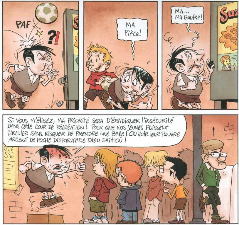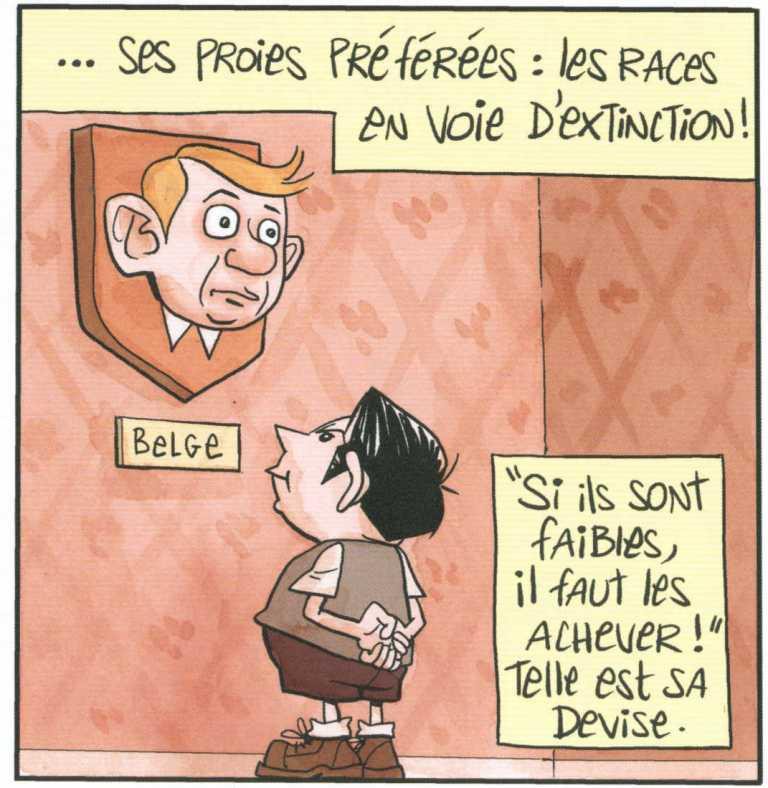 Vous aurez compris que, pour moi, ce n’est pas un album qui « déchire » mais il s’agit d’un produit dans l’air du temps. Je ne vais pas parler d’un album « gentil » mais plutôt « vénéneux ». Le journal flamand «De Standaard » parle d’un petit Nicolas en négatif. C’est flatteur mais avec la poésie en moins et cela fait une grosse différence. Je pense que l’album va fonctionner mais quand je vois la mention « tome 1 », je me pose quand même des questions…J’ai même vu un site en faire un « coup de cœur » mais il s’agit probablement aussi d’un effet marketing…Certains sites spécialisés en bande dessinée trouvent tous les albums qui sortent extraordinaires, ce n’est pas le cas sur Samba BD…A livre atypique, chronique fleuve, voilà le résultat de mes cogitations…Chacun se fera son avis. Je me demande si l’album sort en France…Il faudra poser la question à l’éditeur…