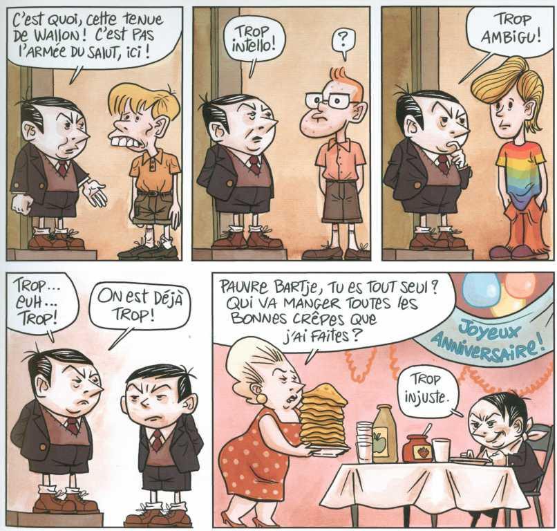 L’album a été imprimé chez Lesaffre en Belgique et est très bien réalisé. La couverture est aux couleurs du drapeau national belge : noir, jaune, rouge. Il représente un Bart De Wever jeune avec un sourire sardonique, une boite d’allumette qui sort de sa poche, et la Belgique et Bruxelles en feu dans l’arrière plan. Il s’agit d’un livre d’humour. Nous sommes dans la caricature, une entreprise de dénigrement systématique qui ne va pas plaire à tout le monde. Certains parlent de « De Wever bashing ». Le principe de l’album est de raconter l’enfance du petit Bartje. Tout au long des planches, Bartje cherche une victime, rejette la faute sur l’autre, passe pour un monstre sans cœur qui a une destinée bien tracée. La série est actuellement en prépublication dans les journaux du groupe Sud presse, le plus important groupe de presse belge en francophonie. La presse flamande en a fait écho et reste à ma grande surprise sur la réserve, restant très zen et polie envers l’album. Mais à ce jour, l’éditeur n’a pas trouvé d’éditeur flamand d’accord de publier l’album en néerlandais. Certains disent qu’en Flandres, De Wever fait peur et que certains libraires et commerciaux craignent des vitrines brisées si l’album est exposé.