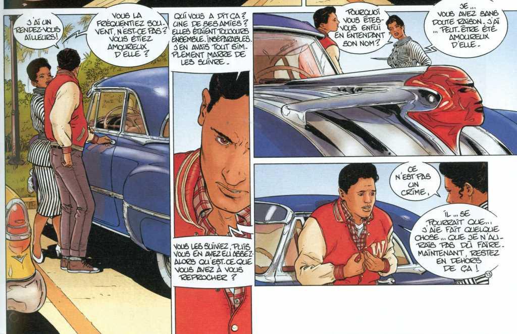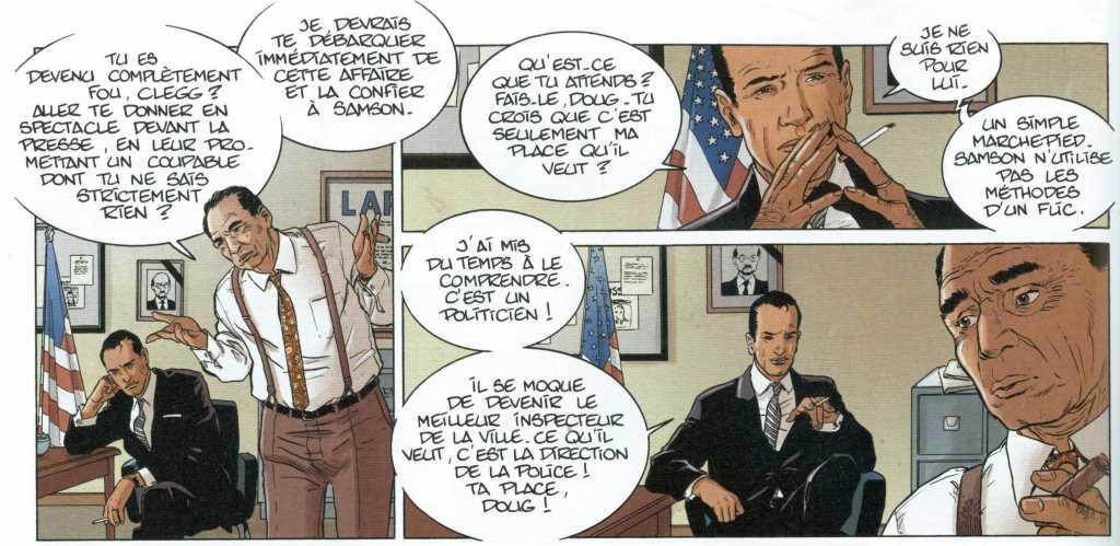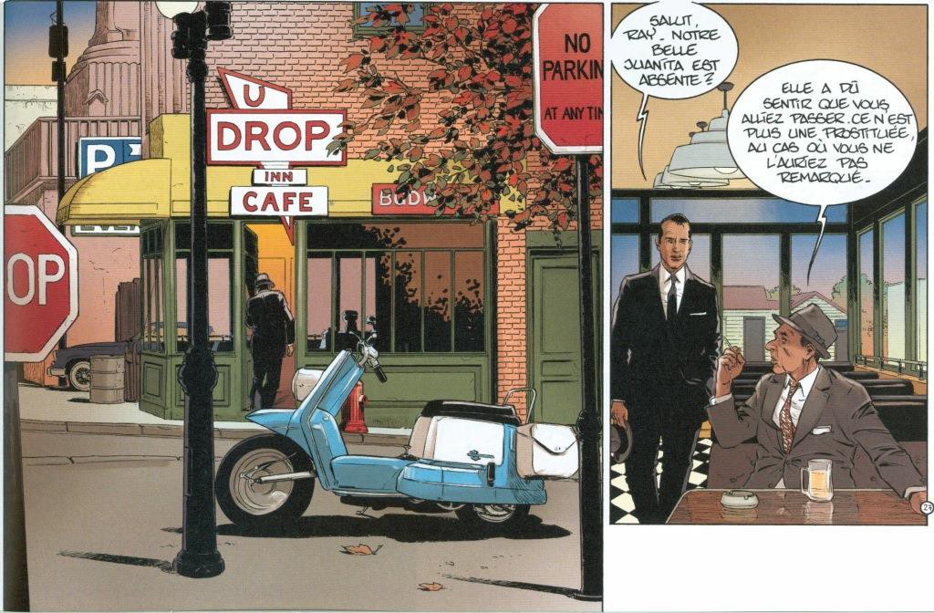 Le scénario de Desberg est bien construit avec de nombreux rebondissements, un paquet de personnages pas toujours très nets, de l’hémoglobine à la sauce américaine des années ’50. Il s’en dégage une ambiance à la fois noire et chargée mais aussi la lumière éclatante du soleil de Californie avec ses voitures d’époque, ses bars très cinématographiques, des jolies filles,… que demande le peuple ?