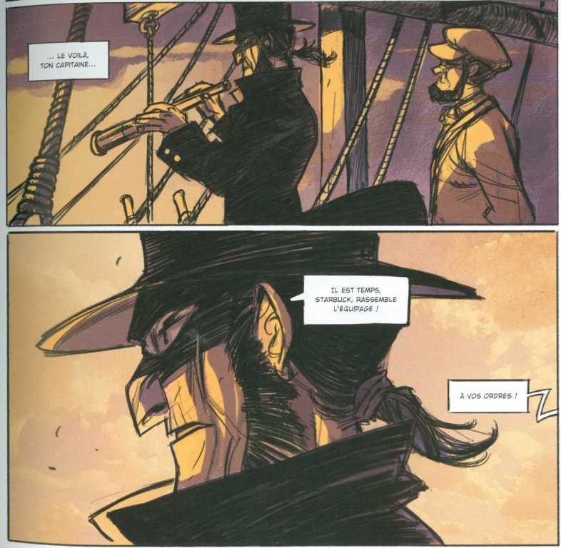 Résumé (de l’éditeur) : Herman Melville, qui fut marin, s’inspira de faits réels pour donner naissance à Moby Dick – un livre culte qui inscrivit un nouveau mythe dans la mémoire des hommes : celui de la baleine blanche. Il y raconte la quête furieuse, mystique et désespérée du Capitaine Achab et son dernier affrontement avec Moby Dick. Une quête folle adaptée et maîtrisée par deux talents, deux sensibilités – celles d’Olivier Jouvray et de Pierre Alary.