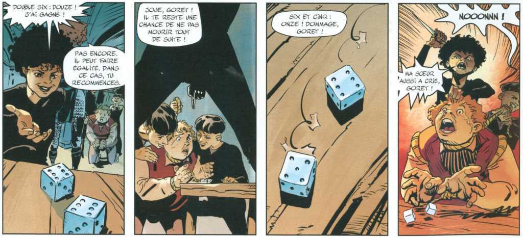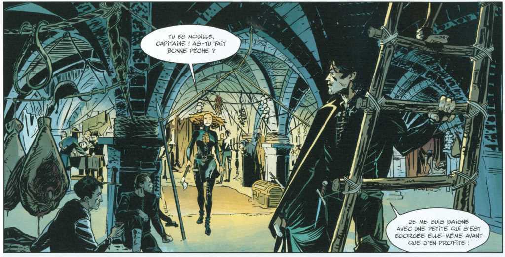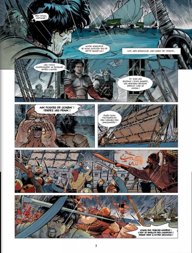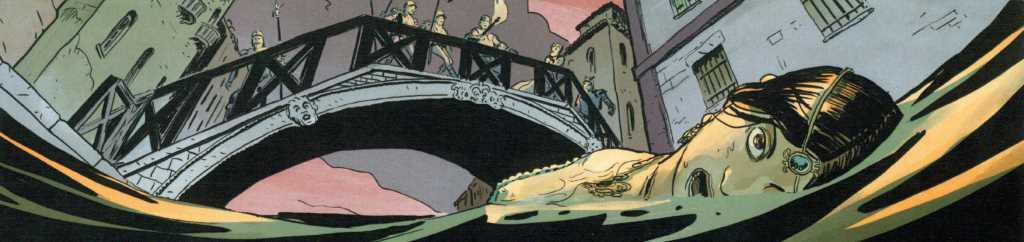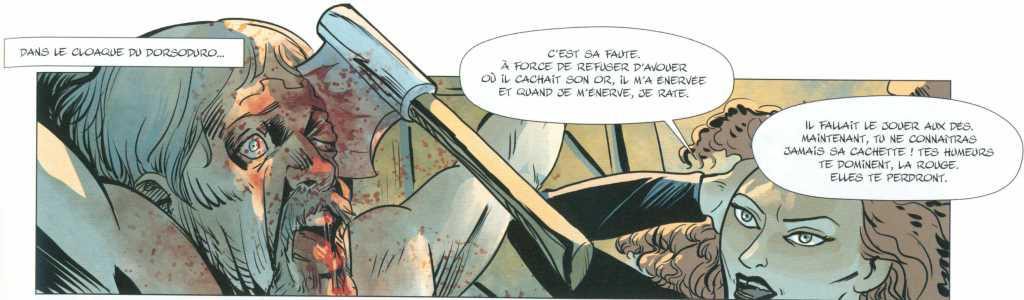 Le scénario est confié à Patrice Ordas, qui n’est pas le premier venu et qui a quelques bons albums derrière lui. Donc à nouveau un a priori positif à la vue du nom du scénariste. Encore une fois, il a fallu déchanter rapidement. Une aventure de « cape et d’épée », noire et torturée…En effet, le « cape et l’épée » relève plutôt du couteau et de la boucherie. Noire, très noire en effet. J’ai dénombré sur l’album pas moins de 14 meurtres. Des scènes violentes, gratuites et qui n’amènent pas grand-chose à l’histoire. Plutôt que l’Histoire de Venise, on nous conte l’histoire d’une dépravée, enlevée pour une rançon par un groupe de criminels déjantés et désaxés. Ils ne pensent qu’à tuer pour un « oui » pour un « non », de torturer, de violer,…Bref, que des êtres vils et sans charisme. Quel beau tableau. Pauvre Venise !