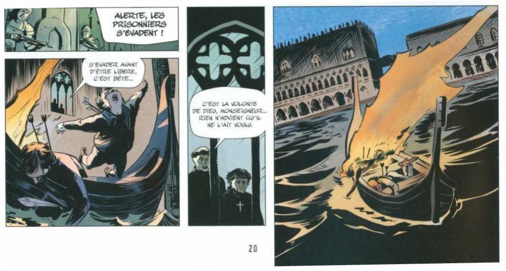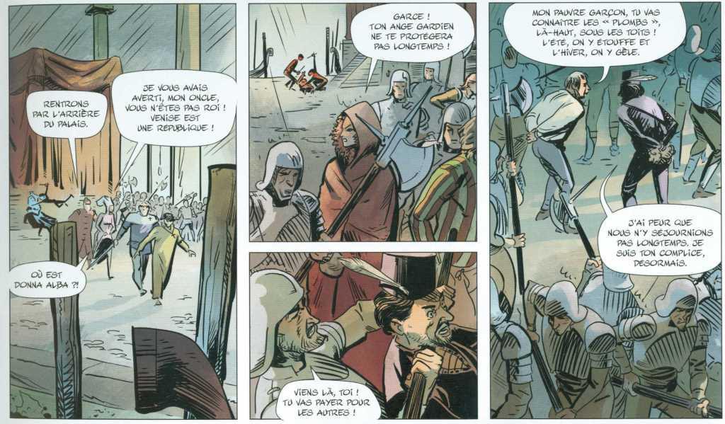 Mon avis : En général, j’aime bien la politique éditoriale de « Grand Angle » qui m’a permis de découvrir de beaux albums. En recevant cette bande dessinée, j’ai aimé la couverture qui donnait envie d’ouvrir l’album . Je suis donc parti avec un a priori positif. Sur le site internet de l’éditeur, je lis : « Une aventure de « cape et d’épée » noire et torturée dans la majestueuse Venise des Doges du XVIe siècle ». On ne peut plus être plus clair. Je remarque aussi que l’album n’est pas spécialement mis en avant. Pas de bannière à l’entrée du site…Parfois, ce genre de détail est significatif…