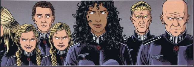 Cette fiction calque son tempo sur les faits historiques des années précédant la seconde guerre mondiale. Ce n’est pas une mauvaise idée. Le lecteur en suivant Diane parcourt les différents lieux à fait historiques « forts » : Dachau, la guerre civile Espagnole…., le tout sur fond de paranormal. L’histoire dans l’Histoire démontre, en suivant Diane Hunter, le contrôle mental, et donc l’influence des nazis mentalistes sur les personnages clef de cette époque troublée. Ainsi, les médiums nazis auraient influencé le général Franco de rentrer en rébellion contre le pouvoir Républicain. Le spiritisme omniprésent est la carte de visite d’Hindenburg. Objets, personnes, cours de l’histoire, rien n’échapperais au pouvoir de ces êtres au don particulier. D’aucun penseront à la série « je suis Légion » de Fabien Nury. Mais le récit est ici différent. Il est plus éclectique avec plus de protagonistes. Et c’est, peut-être, un moins de cette série : l’action très présente ne laisse pas beaucoup de temps aux personnages de prendre de l’envergure. Des retours en arrière sont nécessaires pour retrouver « qui est qui » dans cet univers pléthorique. Parfois les ellipses sont un peu trop poussées : l’évasion de l’héroïne de Dachau est tirée par les cheveux ou le passage d’une zone historique à l’autre se fait sans transition. Mais le tout rempli sa mission divertissante et captive aisément son public dans l’attente, évidemment, d’une confrontation entre les deux groupes.