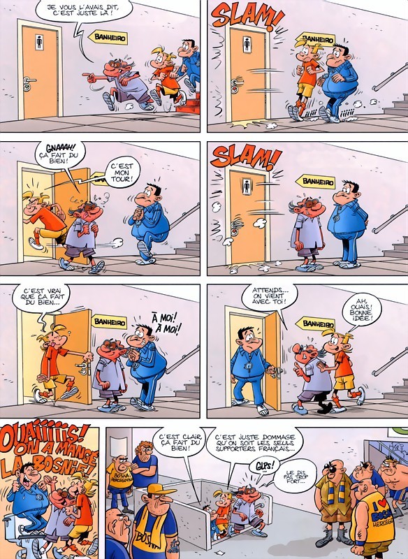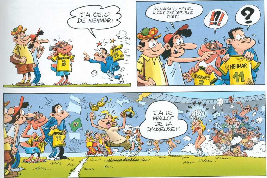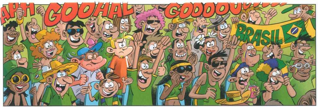 Résumé (de l’éditeur) : Pour voir leur équipe triompher, ils ne seraient pas contre une révolution dans le pays où le football est roi. Car, c’est bien connu, dans les stades brésiliens, il y a un peu plus de monde que trois tondus… et un Pelé ! Pour nos supporters parfois insupportables, trouver sa voix dans la chaude ambiance des stades brésiliens relèvera donc de l’exploit. Mais notre fine équipe ne va pas au Brésil pour faire du tourisme, et si la victoire n’est pas sur le terrain, elle sera à coup sûr dans les gradins !