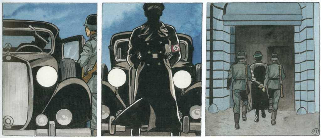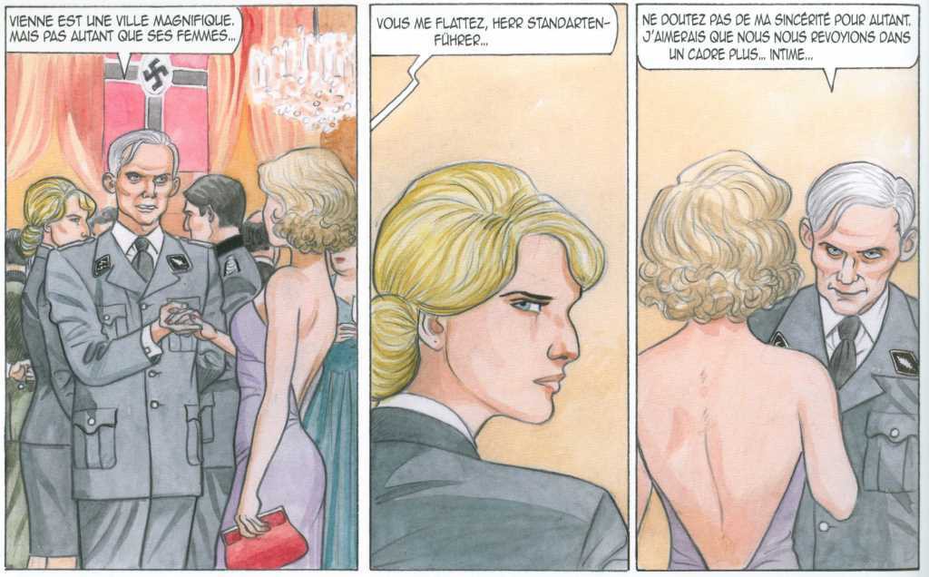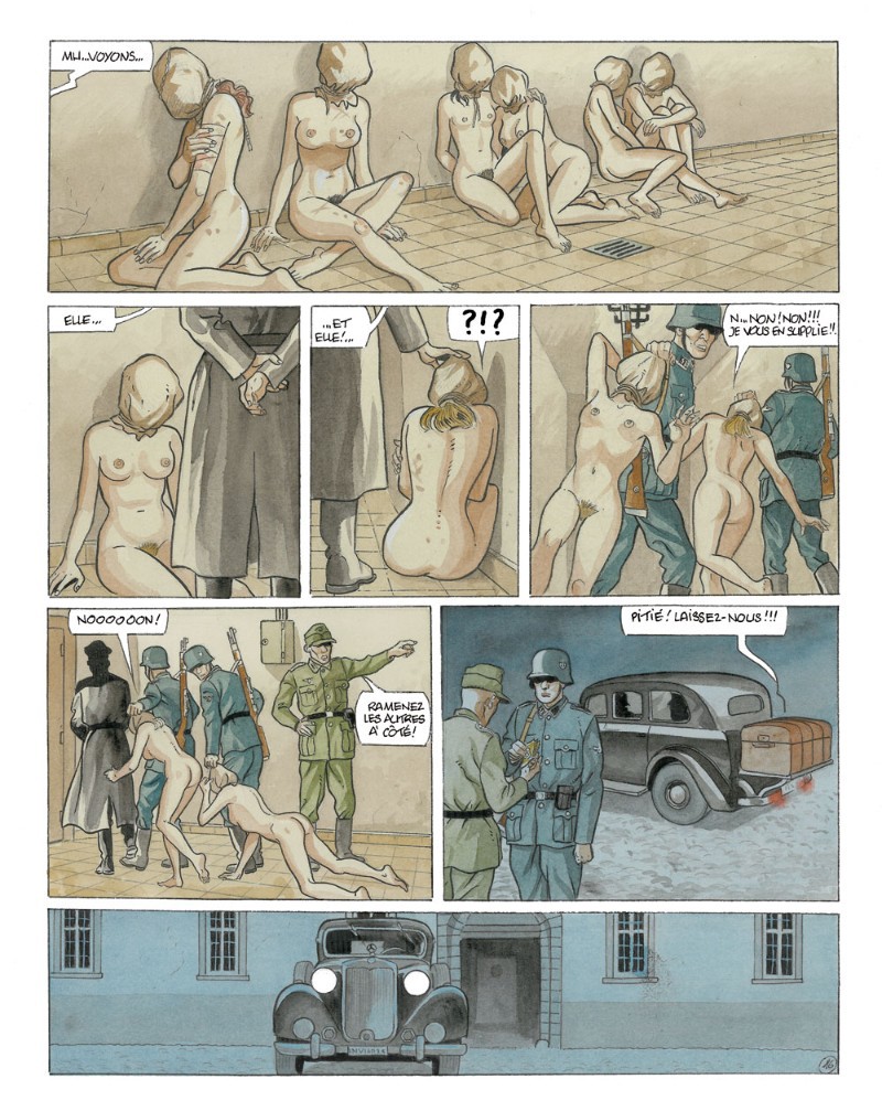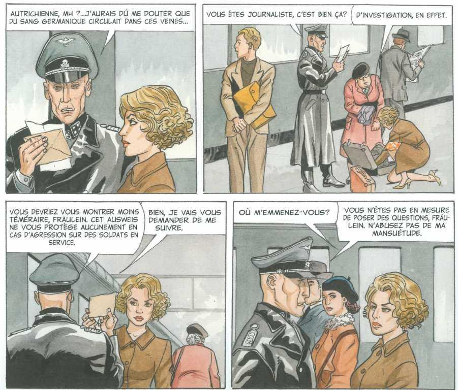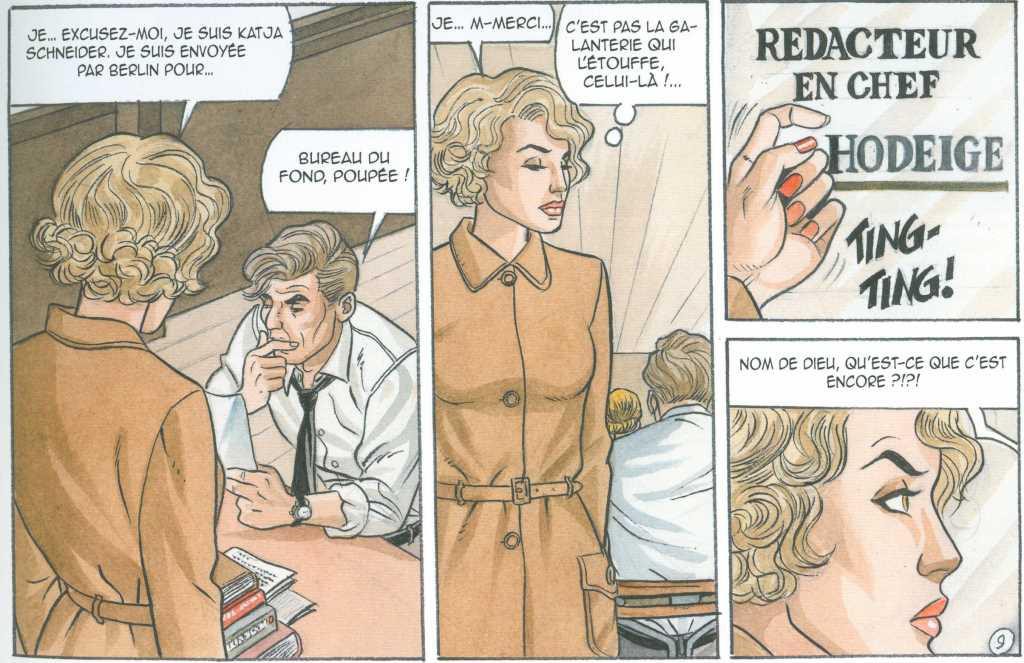 Au niveau du dessin, Renaud fait du « Renaud ». Son dessin est reconnaissable entre tous, « sa patte » est là, assez classe et bien en place. Son graphisme, comme les couleurs, reste cependant dans la retenue, un peu froid…La période traitée, l’occupation de la Belgique par les nazis en 1944, « Le Soir volé », la persécution des juifs, ne laisse pas place à la gaudriole…On découvre une héroïne atypique, une autrichienne, envoyée au Soir par Berlin mais elle a des sympathies pour la cause juive. Elle joue un double jeu. Même si le lecteur connait son engagement, le scénario de Gihef reste malgré tout dans les grandes lignes et ne détaille pas plus le caractère, l’aspect psychologique du personnage principal, Katja, qui à ce moment de l’histoire manque un peu de charisme. Mais, il faut rester clair et honnête vis-à-vis de ce premier tome, il s’agit d’une mise en place et le tome 2 devrait développer plus en profondeur le sujet. Le diptyque est donc un ensemble qu’il faudra juger sur sa totalité.