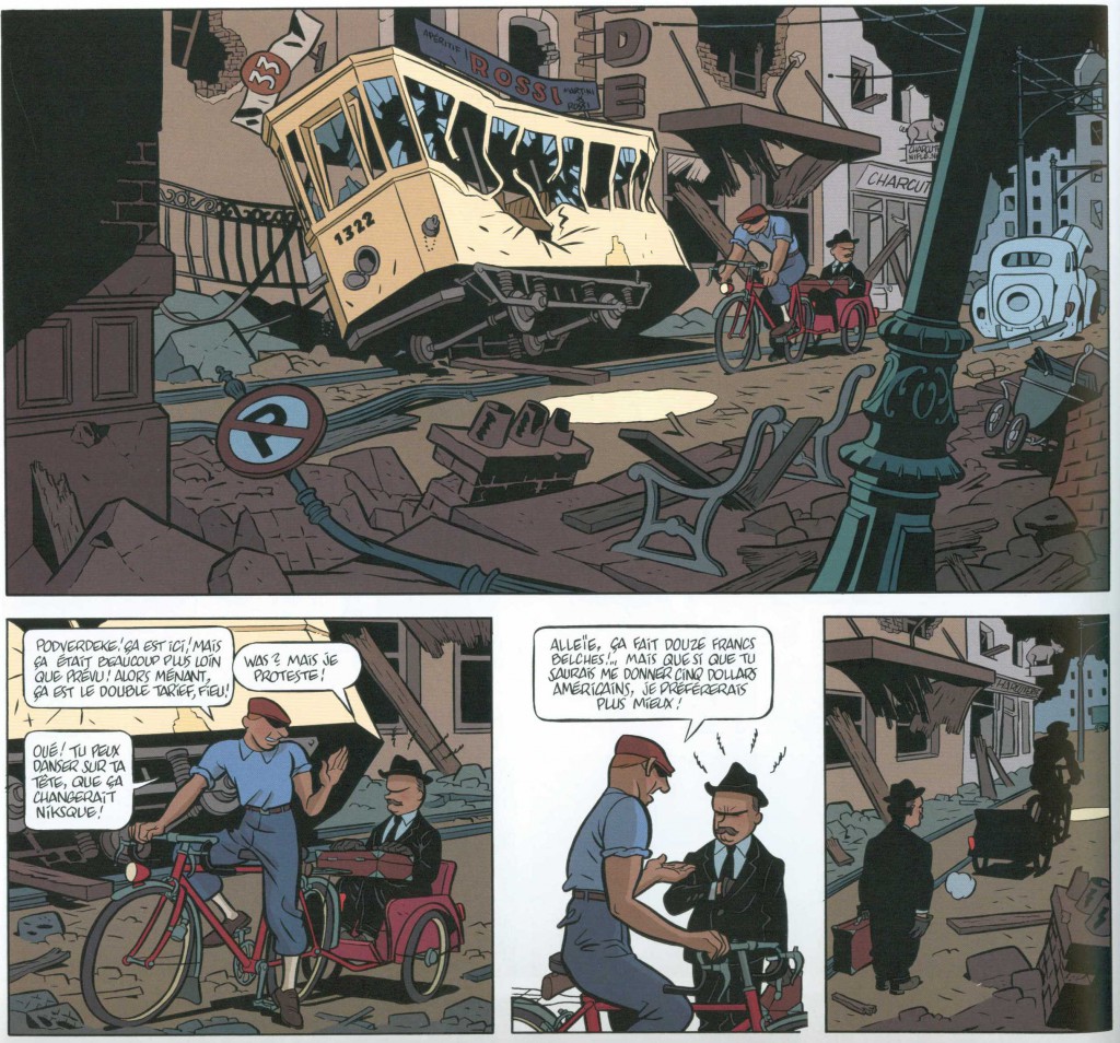 Le dessin est fantastique, expressif et me rappelle d’une certaine façon son illustre dessinateur qui est Franquin. Ce n’est pas du Franquin mais l’idée et la philosophie est fort proche. J’adore ces grandes cases pleines de petits détails savoureux, humoristiques, des clins d’œil à la publicité de la fin des années ’40. Le Bruxelles de l’après-guerre est superbement rendu. On y retrouve à la fois les difficultés du moment mais aussi une certaine joie de vivre qui se communique au lecteur. Le graphisme est dans la continuité du « Groom Vert-de-gris » et nous raconte en réalité la suite après la fin de la guerre.