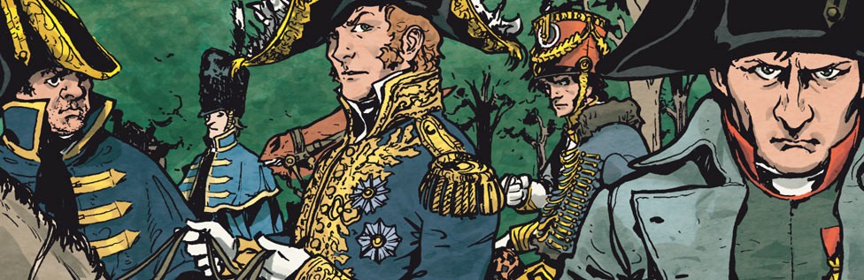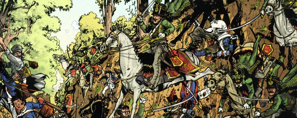 « J’entreprends de vous initier à toutes les horreurs, à toutes les beautés d’un champ de bataille ….Il faut que de son fauteuil, un homme froid voit la campagne, les accidents de terrain, les masses d’hommes, les événements stratégiques, le Danube, les ponts, admire les détails et l’ensemble de cette lutte, entende l’artillerie, s’intéresse à ces mouvements d’échiquier, voie tout, sente…. », Honoré de Balzac, correspondance. Ce projet ambitieux a été réalisé par Patrick Rambaud. Il reprend avec beaucoup de succès (prix Goncourt et grand prix du roman de l’Académie française 1997) le défi de Balzac, dans son époustouflant roman historique, « la bataille ». Ce roman, récit complet de la bataille d’Essling (ou d’Aspern) est adapté en bande dessinée par Fréderic Richaud. Ce dernier n’en est pas à son premier coup d’essai. Il s’était déjà attaqué, avec succès, à la transposition de « la ménagerie de Versailles » que l’on retrouve en bande dessinée sous le titre « le peuple des endormis » avec Didier Tronchet. « La bataille » en BD représente un véritable défi. Le roman originel est dense. Il fourmille de détails et nous transporte d’un endroit à l’autre du champ de bataille au travers des personnages (historique ou non). Pourtant, le triumvirat Gil, Rambaud, Richaud y arrive admirablement. Fidèle au livre, la BD donne des images, un support à l’écriture de Rambaud.