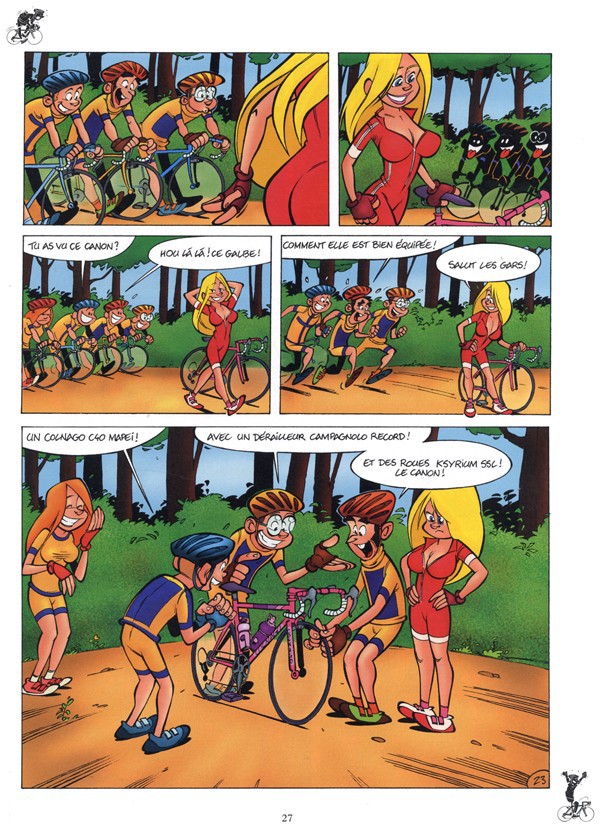 Résumé (de l’éditeur) : Nico, Chris, Doumé et Alain ont décidé de faire du sport. Et pas n’importe lequel, le plus noble d’entre eux : le cyclisme. Finies les petites balades du dimanche après-midi, les quatre amis se sont inscrits dans un club local pour devenir de véritables grimpeurs et sprinteurs. Et selon les brochures, cette association est dirigée par un champion de la petite reine. Cependant la dernière victoire du président date de 1957 et certains adhérents sont perclus de rhumatismes !! Néanmoins, ces vétérans du Tour de France, malgré leur grand âge, ont bien des choses à apprendre à ces petits jeunes qui comptent (trop) sur les performances de leur matériel. Ainsi, de pelotons en balades bucoliques, de crevaisons en échappées, la fine équipe, bientôt rejointe par Candice, va faire de gros progrès.