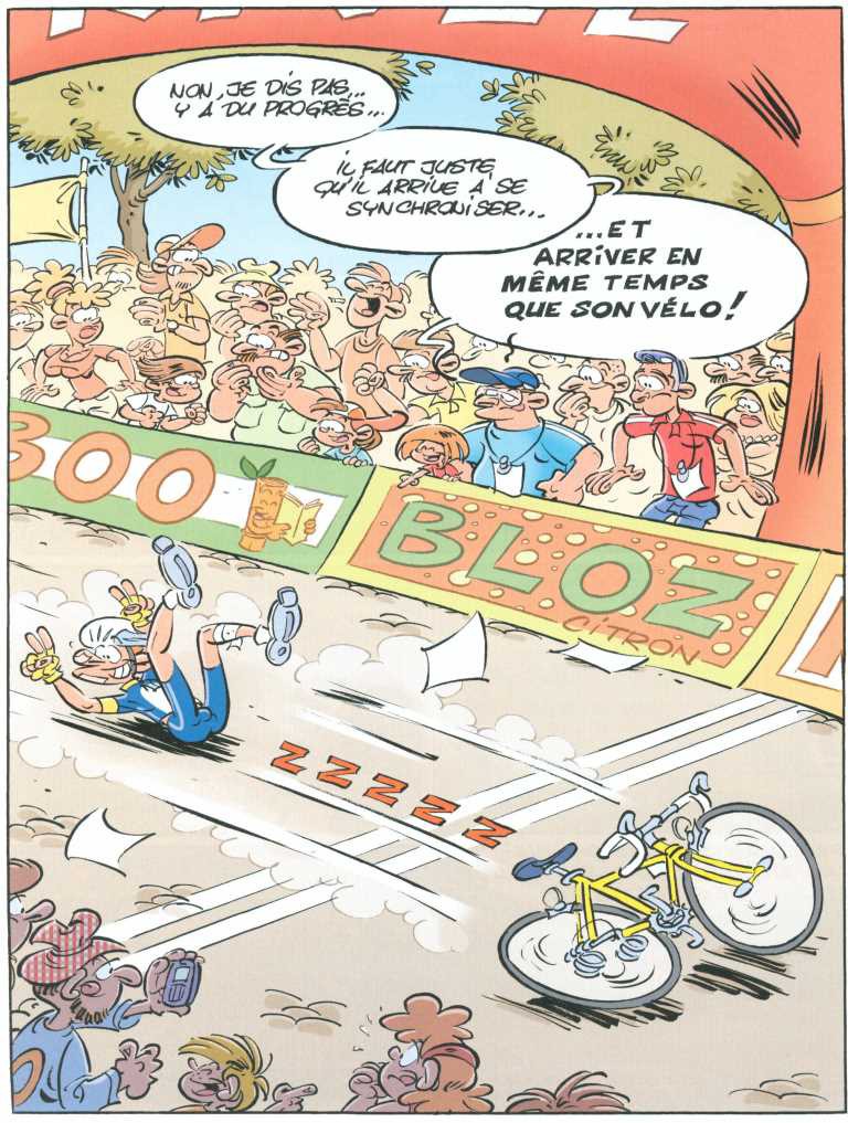 Résumé (de l’éditeur) : Laurent Jalabert a disparu ! Le grand champion cycliste, reconverti dans le triathlon et consultant audiovisuel, aurait été vu pour la dernière fois enjambant la « Selle », petite rivière desservant les villages de Granplato, Petipignon, Coursan-la-Selle et Pignon-sur-Rut, entre autres. Enlèvement ? Retour aux sources ? Personne ne sait… Ah si ! On nous signale que notre Jaja national serait sain et sauf au sein du club des Vélomaniacs de Pignon-sur-Rut, où il épaulerait le coach du club pour élever le niveau. Fini le Vélo, boulot, dodo ! Avec Jaja, les Vélomaniacs attaquent le triathlon de l’humour !