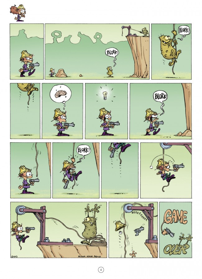 Mon avis : Vu sur le site de l’éditeur : «Malchanceux depuis la nuit des temps, le Petit Barbare, double virtuel de Kid Paddle, a déjà fini brûlé, transpercé de toutes parts, découpé en tranches, dévoré, désintégré, écrabouillé, noyé… Il faut dire qu’entre les successions de pièges vicieux, cette princesse gourde à souhait qu’il faut sauver et ces blorks plus bêtes que méchants, le Petit Barbare a fort à faire s’il veut se sortir vivant des redoutables labyrinthes qui peuplent son monde virtuel. Voilà déjà onze albums que ses aventures imprévisibles se soldent systématiquement par un implacable « game over »… or il ne semble pas près de prendre sa retraite, et c’est tant mieux ! »
