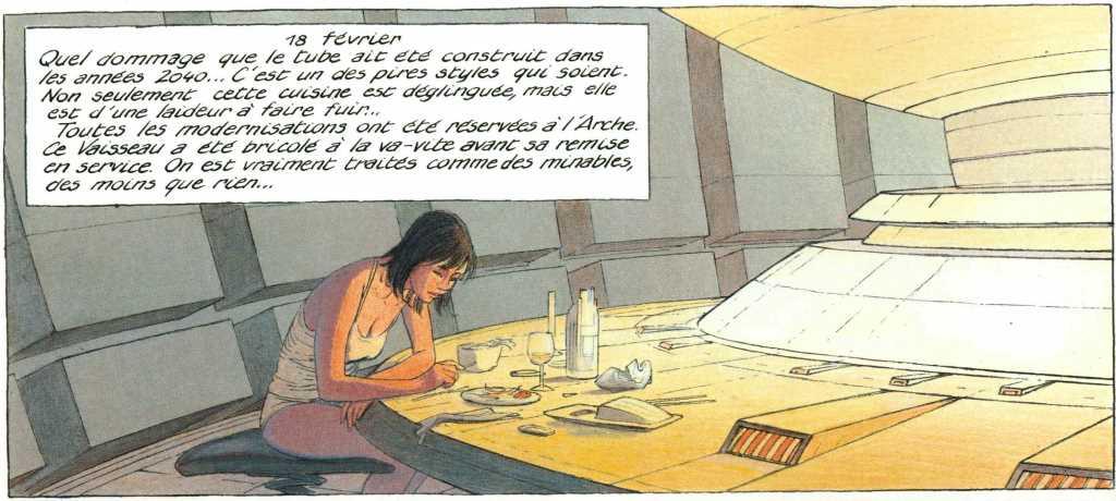 Par contre, j’ai été un peu déçu par le scénario ou plutôt par ce premier tome. Les auteurs veulent nous faire revoir Paris mais Paris se fait attendre. Il faut en effet être très patient…L’histoire en elle-même part en mode mineur, comme les passagers enfermés dans le vaisseau spatial en direction de la terre. Par moment, je me suis même un peu ennuyé en me disant : « alors, elle est où cette ville de Paris ? ». Le personnage principal s’appelle Kârinh. Elle est la plus jeune des passagers (parmi une horde de vieilles personnes) et a été catapultée chef de bord. Mais elle est toxicomane et abuse de substances pour rêver et essayer de retrouver dans ses rêves ses parents et la ville de Paris. L’histoire devient bien plus intéressante lorsqu’elle arrive enfin sur terre et se dirige vers Paris au départ du port du Havre, devenu la banlieue et le port de Paris. Nous sommes à ce moment déjà à la page 47 et Kârinh arrivera à Paris à la dernière planche du tome 1.Grosse frustration donc. Autant dire que le meilleur reste à venir avec le tome 2. Ce tome 1 n’est en réalité qu’un échauffement avant le vif du sujet.