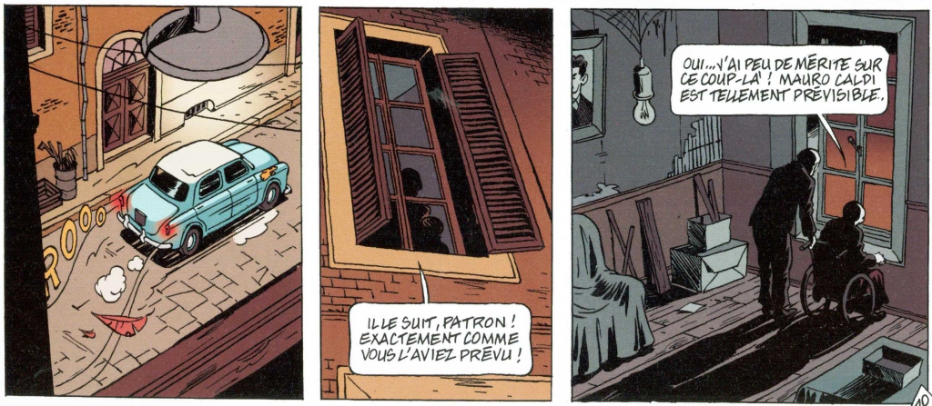 Résumé (de l’éditeur) : Mauro s’entraîne sur les routes de campagne des environs de Brescia. Gigi, son co-pilote, écrit des indications sur sa conduite sur un dérouleur de notes. Ce dernier suspend l’entraînement pendant quelques jours. Il doit s’absenter, comme chaque année, pour rendre visite à une vieille dame. Gigi se montre fuyant lorsque l’on lui demande des précisions. … Ce qui attise la curiosité de Mauro. Qui est- cette vieille dame ? Pourquoi tant de mystère ? Mauro fouille dans les affaires de son ami. Il n’y trouve qu’un vieux dérouleur de notes. Rien d’intéressant… Mauro Caldi se décide à suivre son ami lorsqu’il reçoit le message d’un corbeau. On le prévient. Un lourd secret va bouleverser sa vie. Quel est-il ?