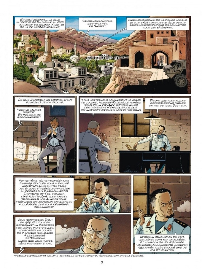 En plus, comme tout bon scénariste qui se respecte, il enrobe l’histoire d’un fond historique et d’un arrière-plan de l’actualité. Ici, il s’agit de la crise iranienne et de la tentative de cet état de se doter de l’arme atomique, malgré la désapprobation du monde occidental et d’Israël. Bien vu ! Jean Van Hamme a écrit une préface qui explique en une petite page le contexte géopolitique en s’appuyant sur un livre du professeur de Politique internationale Jacques Rifflet.