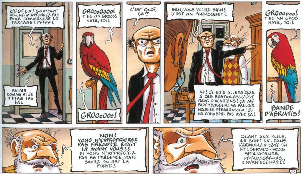 La situation est cocasse. C’est une sorte de huis clos de l’espace qui se fait rencontrer des gens improbables, complètement à l’opposé les uns des autres, qui ne se seraient probablement pas rencontré en d’autres circonstances. D’où, l’importance du vivre ensemble, et cela ne semble pas gagné ! Turf nous dresse un vrai vaudeville avec des scènes diverses, souvent bien amenées comme celle de l’escalier, du perroquet qui crie sans arrêt : « bandes d’abrutis », de la capsule spatiale, et j’en passe…J’ai surtout apprécié certains dialogues qui sont très second degré et qui valent par moment leur pesant d’or.