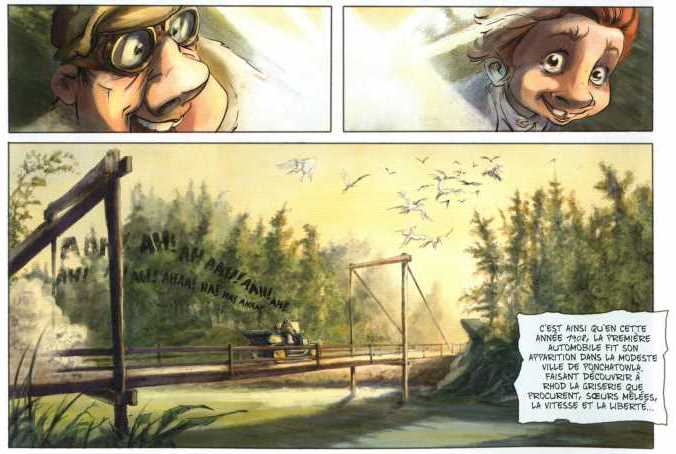 D’autre part, le dessin est radicalement différent. Loisel et Tripp travaillent en parallèle et proposent un dessin très élaboré, avec des interventions successives et qui s’accumulent les unes aux autres. Ici, Dominique Monféry travaille seul sur le dessin. Il nous propose des traits plus conventionnels mais pas dépouillés de qualité. Le graphisme est maîtrisé, très expressif, au bord de la caricature, de la farce, qui souligne justement ce ton proche de la comédie humoristique. Le scénario de Thierry Chaffoin est un voyage agrémenté de petits détails savoureux qui se transforme rapidement en une expédition qui risque de partir en eau de boudin…