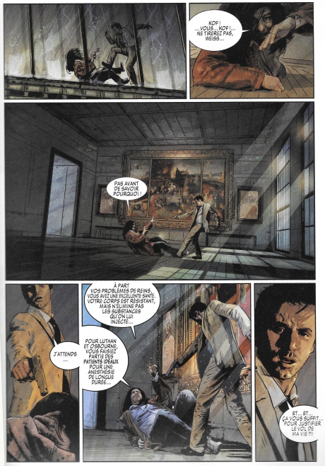 La mort et son cortège de questions sont au centre de ce thriller. Et c’est le premier atout de cette série. La résurrection par la science moderne est un grand fantasme de l’humanité. De savoir ce qui se trouve derrière le grand mystère, nous titille tous. Xavier Dorisson l’intègre avec intelligence dans son scénario. Le problème avec ce genre de question, est ….l’absence de réponse. La pirouette finale en est la preuve. Nous pourrions tout aussi bien digresser sur de nombreux tomes sans arriver à une véritable réponse satisfaisante. Le sujet est donc bigrement périlleux.