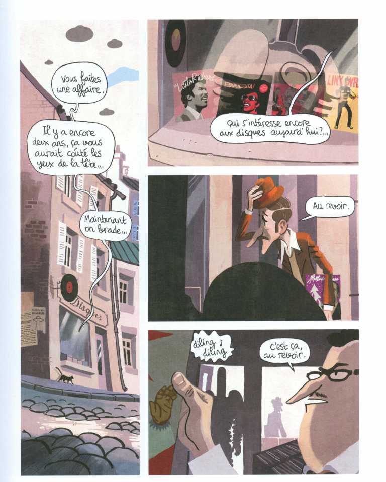 J’ai eu l’impression par moment que le scénariste voulait me refiler sa collection de vinyles. Les références discographiques sont multiples surtout en ce qui concerne la musique jazz et pop des années ’60. J’ai passé un excellent moment en suivant les péripéties de la vie de Christian, le disquaire et de son pote, cette espèce de robot en visite sur terre. Assurément une petite surprise pour ma part. Je ne m’attendais pas à trouver un album si bien fagoté. En plus, c’est un album one-shot mais un bon scénariste peut toujours pondre facilement une suite à ce genre d’histoire…
