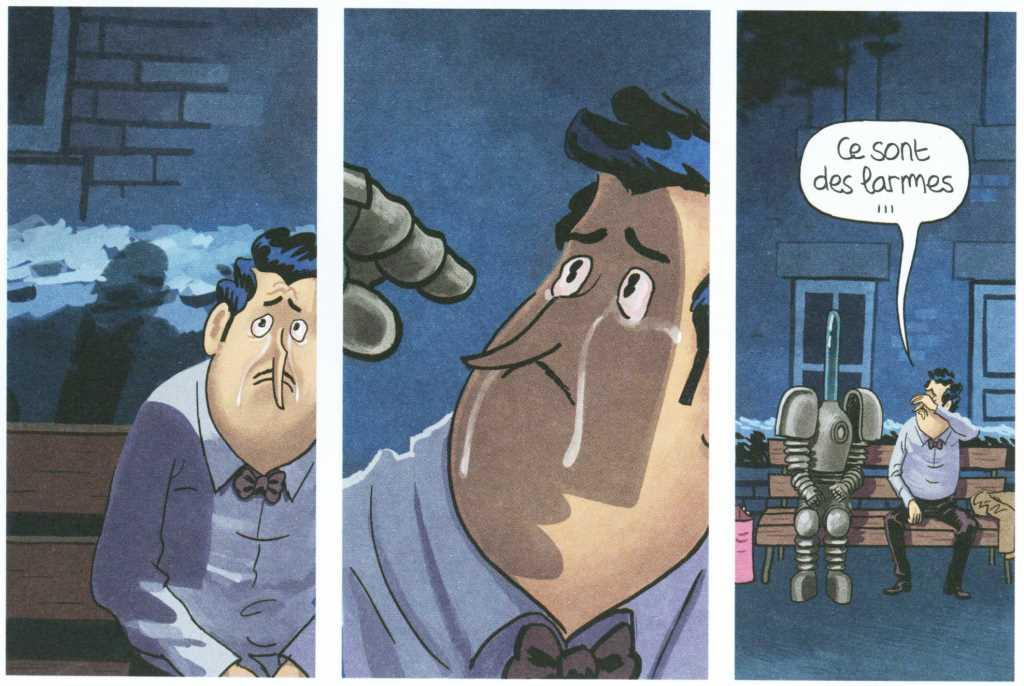 Résumé (de l’éditeur): Dans un délicieux univers uchronique où les êtres humains et les aliens cohabitent à la façon d’un film des années 1950, Christian est un cinquantenaire un peu blasé. Disquaire dans un monde où l’humanité a fait sa grande rencontre du troisième type avec une espèce hyper évoluée, il a du mal à envisager l’avenir de sa profession. Et pourtant un jour, l’un de ces robots extra-terrestres, curieux, franchit le pas de sa porte pour lui demander d’écouter de la « musique humaine ». Agacé, intrigué puis amusé, Christian sympathise petit à petit avec cet être venu d’ailleurs… Il se met même en tête de lui faire découvrir les différentes formes d’art : il lui fait écouter de la musique de tous les horizons, l’emmène dans les musées, l’initie à la philosophie… il lui passe même ses revues pornos ! Un jour, Christian découvre une chose incroyable : son ami de métal a le pouvoir de projeter les gens à l’intérieur des œuvres !