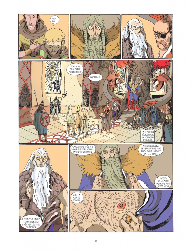 Bjorn le Morphir est avant tout une série de romans de Thomas Lavachery publiés à l’Ecole des loisirs entre 2004 et 2012. Une première adaptation sous forme de bandes-dessinées était sortie entre 2009 et 2013 chez Casterman. Cette adaptation était complément passée inaperçue, sans doute due à son format particulier. En ce début de l’année 2015, Rue de Sèvres, la branche BD de l’Ecole des loisirs republie ces 4 tomes parus chez Casterman cette fois en trois volumes. Et un tome 4 en mars 2015. Rue de Sèvres a revu la maquette et le format de Bjorn le Morphir. Elle donne à la série un nouveau souffle. Ce format est franchement une réussite avec de nouvelles couvertures, une jaquette rigide, des planches plus lisibles et plus grandes…. Pour revenir au fond, les vikings, leurs légendes et leurs panthéon ont toujours été une bonne source d’inspiration dans toutes les formes d’expressions artistiques. L’univers médiéval scandinave, rehaussé d’une touche de fantastique, donne ici un excellent résultat sous la plume de Thomas Lavachery. Tout en reprenant le schéma traditionnel des romans d’apprentissage (chevalerie, héros timide qui devient un héros, duels à l’épée), il n’oublie pas l’humour (le troll qui zozotte) et l’inévitable dose de romantisme avec l’amour de la belle Sigrid !