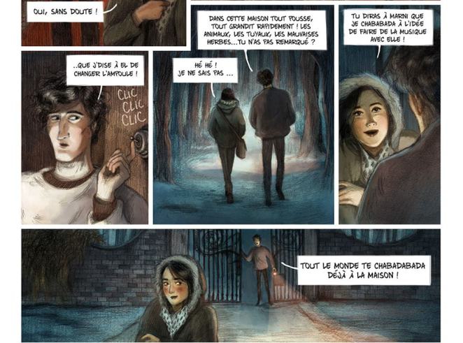 Le scénario est une adaptation libre (mais très fidèle) du livre éponyme de Malika Ferdjoukh. Pour cela, le duo Simon Eddy / Camille Benyamina a été sollicité. Ces auteurs ne sont pas inconnus dans le monde de la BD. En 2014, ils avaient publié chez le même éditeur « Violette Nozière, Vilaine Chérie » revisitant, en bande dessinée, le plus célèbre des faits divers des années. Malika Ferdjoukh est une auteur prolifique. Elle a écrit ce roman sur un projet des éditions Flammarion : choisir un sentiment exacerbé autour duquel il faudra construire un récit (joie, folie, haine, dégoût, honte, passion…). Et c’est ainsi qu’est né «Chaque soir à onze heures ». Ainsi, le roman de Malika Ferdjoukh se décline autour de l’amour. Diable ! Que voilà un ambitieux programme ! Comment extraire de ce thème un scénario lisible et original (tout en évitant les écueils incontournables) ? Et c’est la tout le talent de Malika Ferdjouk. Tout en parlant de sentiments et de passion, l’auteur introduit des éléments policiers et de mystère. Il en ressort un thriller romantique, un conte sophistiqué de la (haute) bourgeoisie bohème. Le choix du milieu social permet de « ouater » l’ambiance. Même si la mort plane, le cadre chaud permet de se projeter au mieux sur les éléments sociaux et les sentiments (ou tares, c’est selon) terriblement humains. Cette comédie humaine joue sur les différences entre les protagonistes : le garçon taciturne versus le garçon le plus populaire du lycée, la fille invisible mais au talent et à l’aura en devenir versus la demoiselle aveugle mais terriblement attachante et perspicace, les différences sociales. Le tout compose une palette de personnages intrigants ou juste de passage alimentant le scénario. Cela sonne juste. Le coté romantique est un peu « too much » mais plaira à un public dédié.