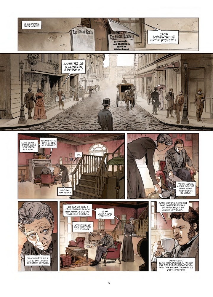Au Dessin, Stéphane Bervas a excellé dans le domaine du jeu vidéo. Provenant de Madagascar, le dessinateur signe le diptyque avant gardiste 2021 avant de se lancer pour ce tome de Sherlock Holmes. Son trait brutal montre à la fois la froideur de ses protagonistes, leurs tendances immorales mais marque également les esprits par une finesse du détail rappelant par moments le style d’Eric Stalner. Chaque nouvel album se verra mis en dessins par un auteur différent, de quoi, ainsi satisfaire un public plus varié. Quant au coloriste, Jean Bastide, ses couleurs claires et grisâtres, s’adaptent au récit, et donnent un sacré coup de fouet, de quoi immortaliser des planches très réalistes.
