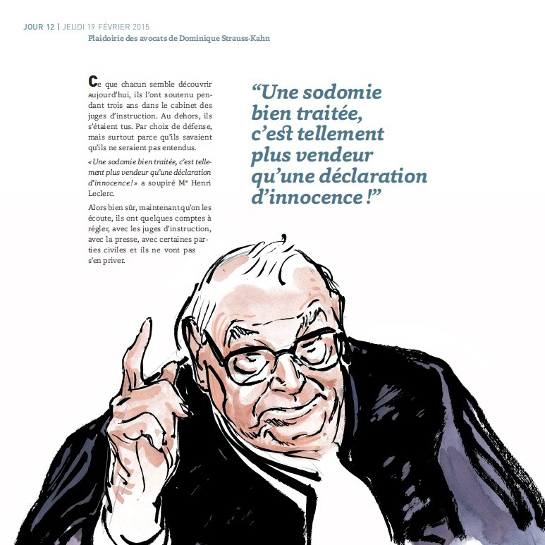 Les croquis de François Boucq décrivent, en quelques traits, l’apathie d’un DSK épuisé par le déluge de scandales qui déferle depuis quelques temps sur ses épaules …Ou bien la lèvre pleine de Dodo la Saumure, maquignon sûr de son droit qui bavarde avec insouciance avec le juge, en homme habitué des tribunaux. Des dessins réalistes, mais qui se permettent aussi d’outrer certains traits .Comme le dit François Boucq »rendre excessifs certains aspects des personnages permet d’affirmer son point de vue, de dire : moi, je choisis cet angle parce que je vois les personnages ainsi. Je ne suis pas neutre .j’assume ma position. »