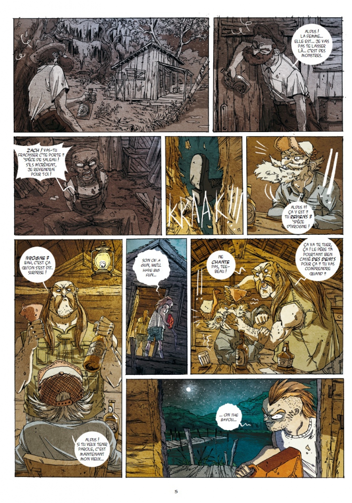 Avec son dessin nerveux, Neyef (Doggybags) nous fait vite oublier le petit défaut de la narration brouillonne. Frisant parfois la caricature, ses personnages sont plein d’expression et de vie et la crasse de ce fond de bayou est très évocatrice.