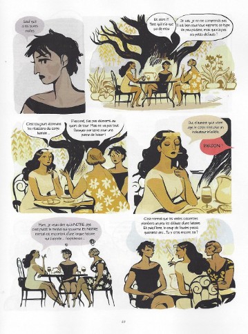 Le dessin de Daphné Collignon m’a séduite. Ses portraits de femmes sont magnifiques, avec leurs grands yeux sombres, un trait épais qui souligne des courbes douces, des formes épanouies… Si le style m’a fait penser à Gaughin ou Matisse, les couleurs n’ont quant à elles rien du fauvisme éclatant, elles sont au contraire puisées dans une palette majoritairement sépia réhaussée de quelques menues pointes de cerise ou de figue…