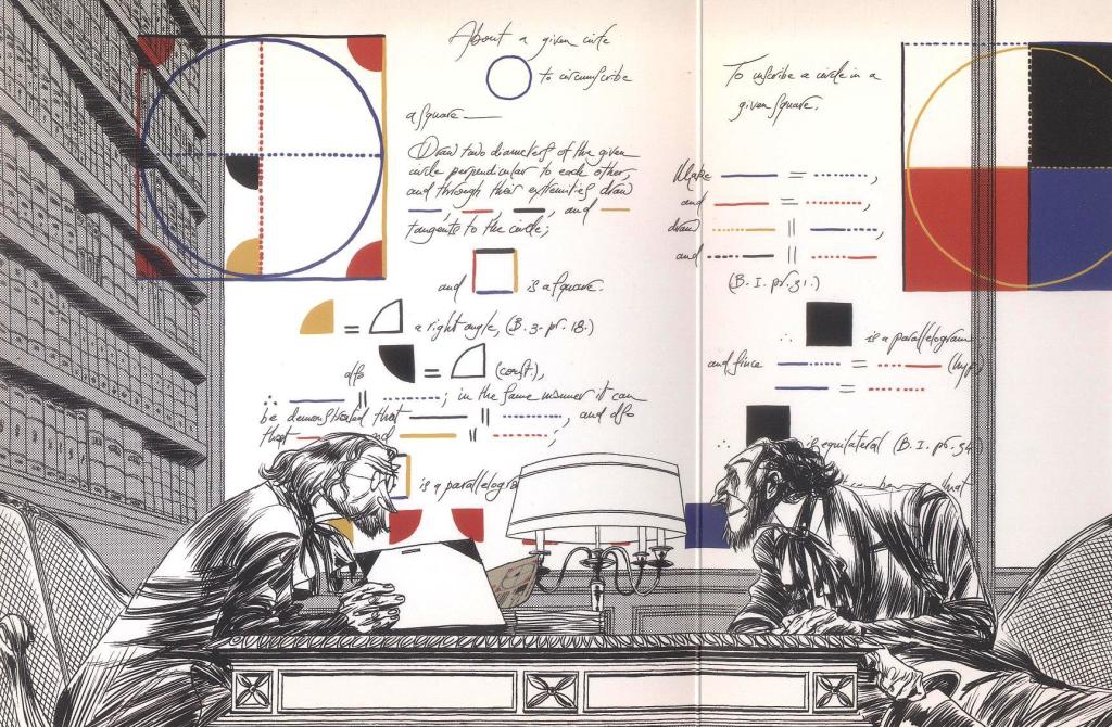 Une union sublime entre l’art et la bande dessinée. Aux prémices de ce projet, un livre The Elements of Euclidpar Oliver Byrne, mathématicien du XIXe siècle qui entreprit d’illustrer la géométrie d’Euclide avec des formes géométriques : des ronds, des triangles, des carrés… rouges, jaunes, bleus… Une théorie évoque la possibilité que Mondrian aurait pu s’en inspirer.