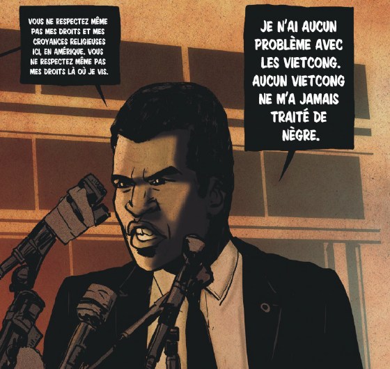 Ce documentaire très bavard, où presque tout est raconté en voix off, fourmille de détails mis en scène de manière très dynamique par Amazing Ameziane. La diversité des techniques employées selon les évènements racontés et l’utilisation intelligente des effets spéciaux donnent à cet album une identité graphique à part et une envergure digne du champion dont il est question. Les mises en images des combats contre Liston, Foreman et Frazier sont d’une intensité, d’une force et d’une beauté incroyables.