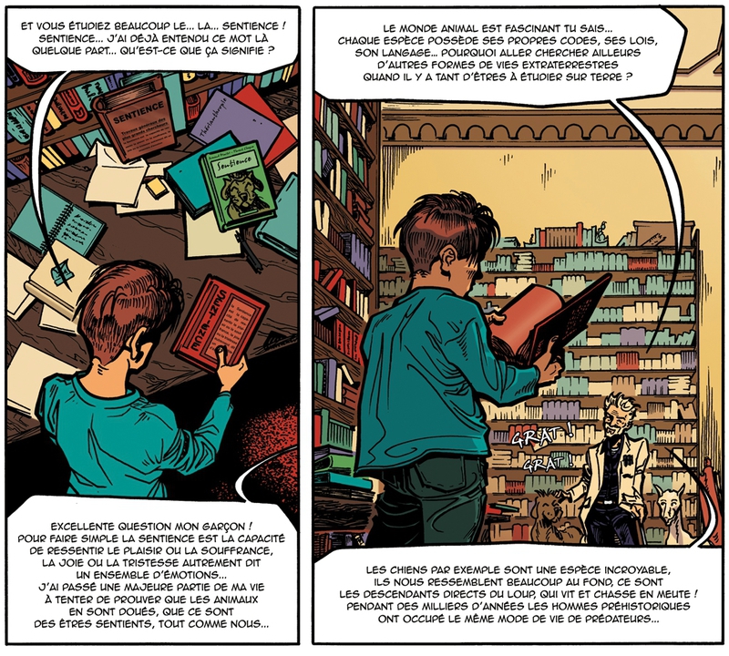 Alors, j’ai rouvert l’album. Je ne vais pas dire que j’ai eu une révélation, mais je me suis laissée intriguer par l’histoire de ce lycéen qui rencontre par hasard un savant fou dans une demeure mystérieuse avec bibliothèque géante et laboratoire secret dignes des improbables bases souterraines de James Bond, et qui par accident se trouve transformé en chien…