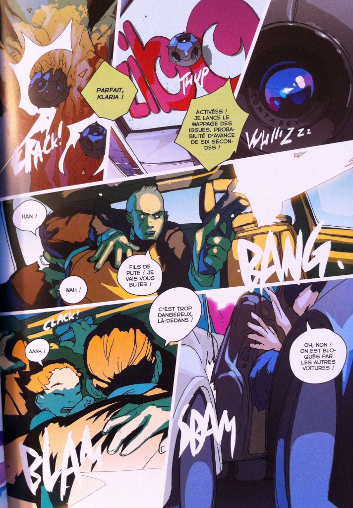 Je suis en revanche beaucoup plus réservé sur la forme. Non pas parce que ce livre est inclassable et à la croisée d’inspirations diverses, mais parce que je trouve que le propos n’est pas assez clairement mis en scène. Il y a beaucoup de scènes d’action, presque trop, où gros plans et surenchère d’effets nuisent à la lisibilité. De nombreuses planches sont difficiles à lire à cause sans doute d’un découpage qui se veut trop dynamique pour servir un scénario à la fois dense et abscons. Du coup, la lecture devient vite pénible et l’on décroche du sujet parce qu’on ne peut rentrer dans les planches. Pour ne rien arranger, le graphisme est déroutant. Mélange de styles et d’influences manga, comics et Franco Belge, le dessin très coloré ou alors dans des teintes plus pastelles, est, d’une planche à l’autre très détaillé ou très épuré, avec entre chaque chapitre des peintures réalistes assez sombres. On se noie un peu dans cette abondance de styles qui s’entremêlent sans cesse.