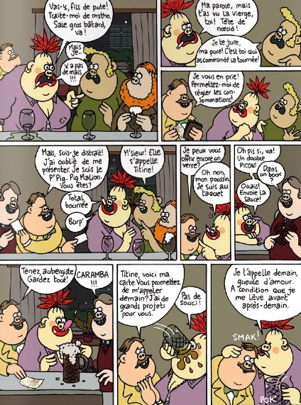 Ce nouvel opus des aventures de Titine, compilation d’historiettes de quelques pages, reste à la hauteur des albums précédents. La vulgarité se conjugue ici avec la beaufitude la plus débridée. Titine est un personnage conceptuel des plus improbables. Titine fume, couche, jure et picole, sans modération. On sent le côté jubilatoire dans des répliques des personnages et dans les situations les plus loufoques : Titine partouze, Titine demande la citoyenneté à Groland, Titine rencontre Jésus … j’en passe et des … pires.