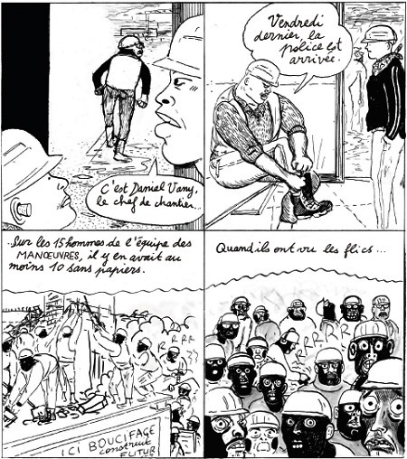 Après La fabrique pornographique de Lisa Mendel, voici déjà le deuxième album de cette nouvelle collection. Adapté d’un travail sociologique de Nicolas Jounin paru en 2008, le scénario démonte avec précision un système de castes très particulier : chefs de chantier français, chefs d’équipe portugais, ouvriers arabes, manœuvres africains, les boubous, les mamadous… Une organisation hiérarchique avec les employés du maître d’œuvre au sommet, puis tous les sous-traitants et enfin la masse des intérimaires, composée essentiellement de travailleurs clandestins.Cette BD reportage aborde sur un ton juste la problématique des ouvriers illégaux, sous-payés, insécurisés et dépourvus de droits. Elle dénonce l’avidité au gain de tous les acteurs du secteur du bâtiment et éclaire les injustices flagrantes.