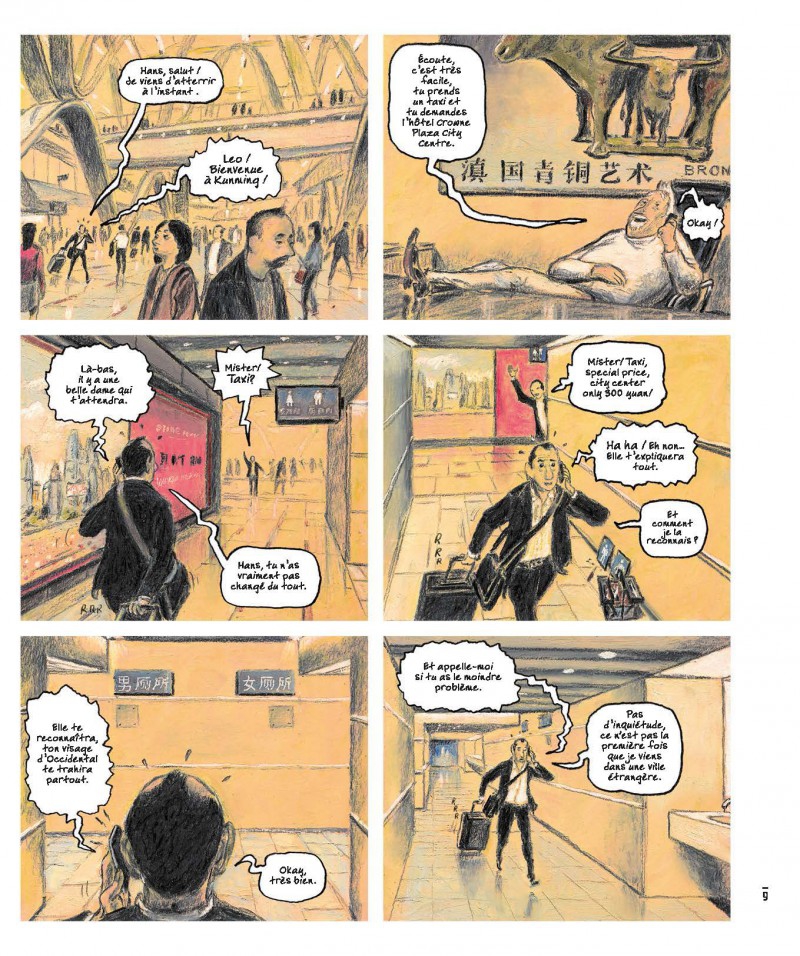 Durant les 60 pages, on suit les déconvenues d’un homme prêt à tout pour mener la carrière d’architecte qu’il rêvait d’avoir. Il se retrouve à des milliers de kilomètres de chez lui dans un univers complètement déshumanisé et pourtant familier. Il retrouve en effet à Kunming tout son environnement familier de Zurich puisqu’il est chargé de participer à la construction de la copie exacte de la ville Suisse. D’ailleurs, le logement qu’il occupe est la copie conforme de celui qu’il a laissé en Suisse.