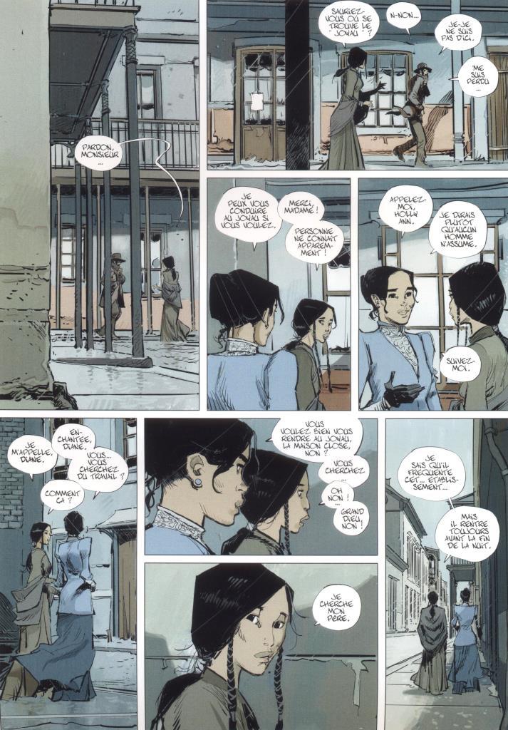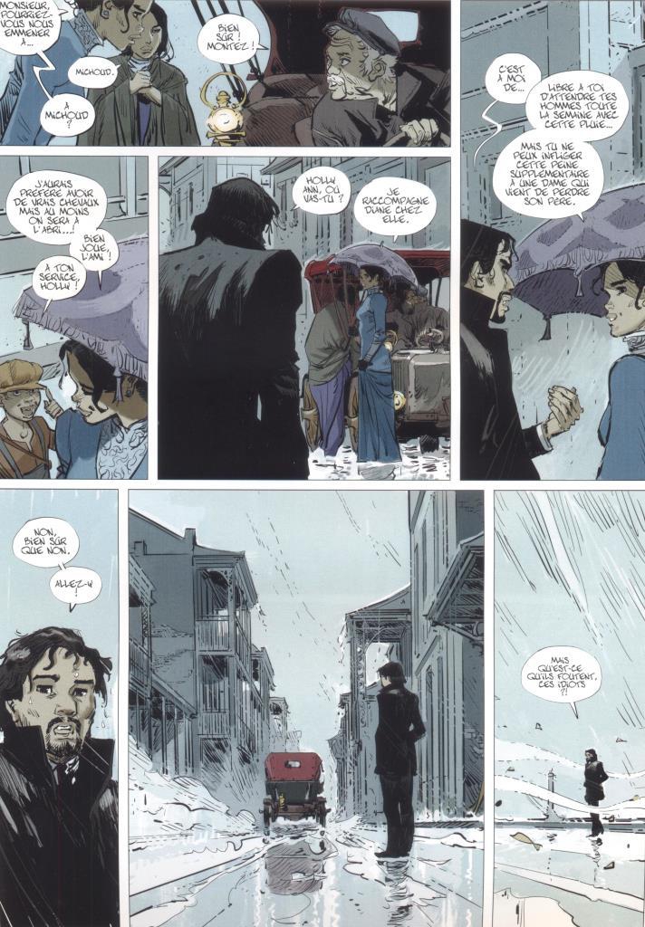 Après une première enquête, récompensée au festival polar de Cognac, Holly Ann, la belle et élégante métisse amérindienne, est de retour pour essayer de résoudre une affaire de meurtre, celui du dernier Indien Natchez de la région de La Nouvelle Orléans. Ce scénario, construit sur une base d’apparence très classique, recèle pourtant quelques subtilités. Il y a ce doute intentionnel sur l’identité du narrateur (de la narratrice ?) de ce récit écrit à la 1ère personne du singulier, ce découpage narratif rythmé par les débords de case et qui sont autant de subdivisions de l’histoire, cette montée en puissance de la tempête et de la pluie en parallèle avec la violence des personnages impliqués, cette découverte progressive du passé mystérieux de l’héroïne. Par ailleurs, les auteurs affirment leur maîtrise des éléments historiques spécifiques à la culture et à l’histoire de la Nouvelle-Orléans.