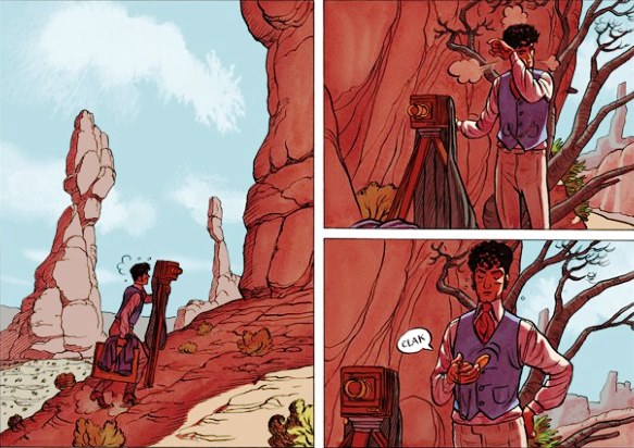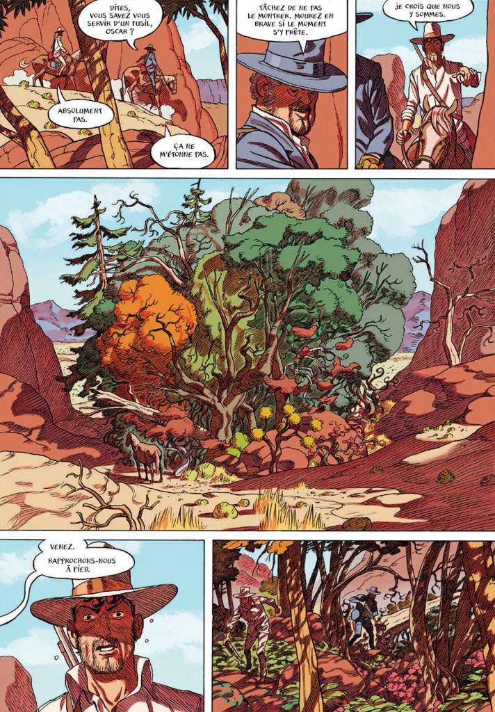 Le dessin de Frederik Peeters s’accorde bien aux décors « westerns ». Ses couleurs sont magnifiques avec une utilisation experte du sépia ou du bleu en monochrome, ses soleils éclatants.