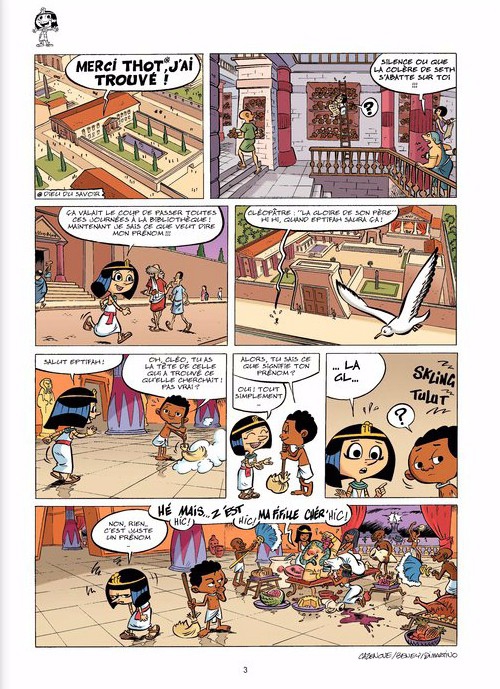 C’est assez facile de voir si une BD a plu ou non à Gaëlle ( 10 ans). Là, clairement c’est le cas. J’avais des craintes que l’aspect historique ne la rebute un peu mais elle a trouvé les textes faciles à lire et à comprendre. Bref mission accomplie pour les auteurs qui ont su admirablement bien doser l’humour avec l’histoire de l’Égypte ancienne. Je remarque aussi que le format une page/un gag est judicieux pour ce genre d’album. Ça doit rester une lecture détente et le bel humour est de sortie. D’ailleurs, le seul truc qu’elle n’a pas trop apprécié pour ne pas dire « pas lu », c’est le cahier didactique en fin d’album sur les mœurs et coutumes de cette civilisation, on faisait de même à cet âge-là non ?