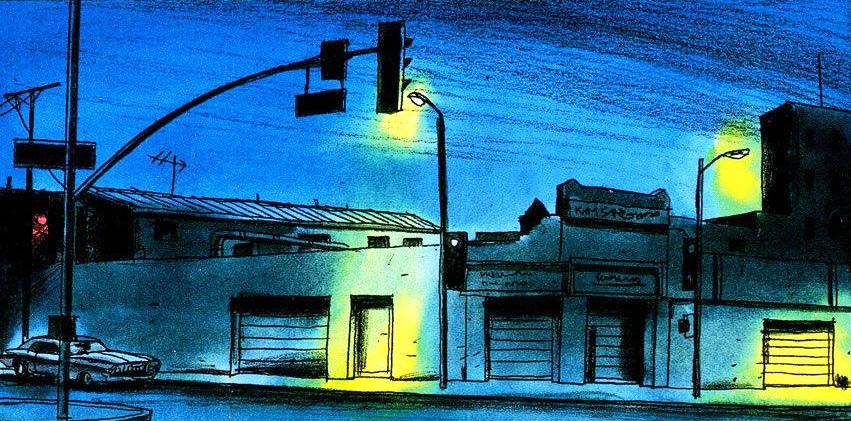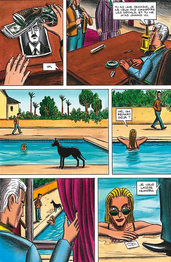 Dans Black dog, les textes illustrés, qui sont la marque de fabrique de Loustal, se mélangent à des passages plus en mouvement ; le trait se fait plus charbonneux, façon Götting. Les cadrages sont totalement revus, avec une touche très cinématographique. On sent l’importance accordée au story-board dans ce travail à quatre mains.