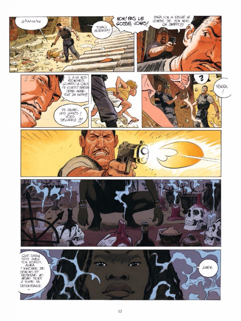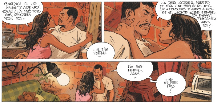 Premier album pour Louise Garcia qui nous plonge de manière réaliste et crédible dans la misère crasse de Rio. Née au Brésil et ayant grandit à Rio, elle connait le sujet et cet album fleure bon la sincérité sans langue de bois. Toute la misère et la violence extrême qui en découle sont décrites avec un réalisme glaçant. On pense bien sûr à la violence entre les gamins livrés à eux-mêmes, quasi obligatoire pour survivre quand on fait partie d’une bande, mais il y a aussi celle des puissants envers les faibles qui veulent éradiquer la misère, en supprimant physiquement ses représentants. Ces flics véreux font froid dans le dos ! Et puis il y a le contraste saisissant de ces mégalopoles Brésiliennes où les plus démunis vivent, dans une indifférence presque générale, au milieu d’une clinquante opulence.