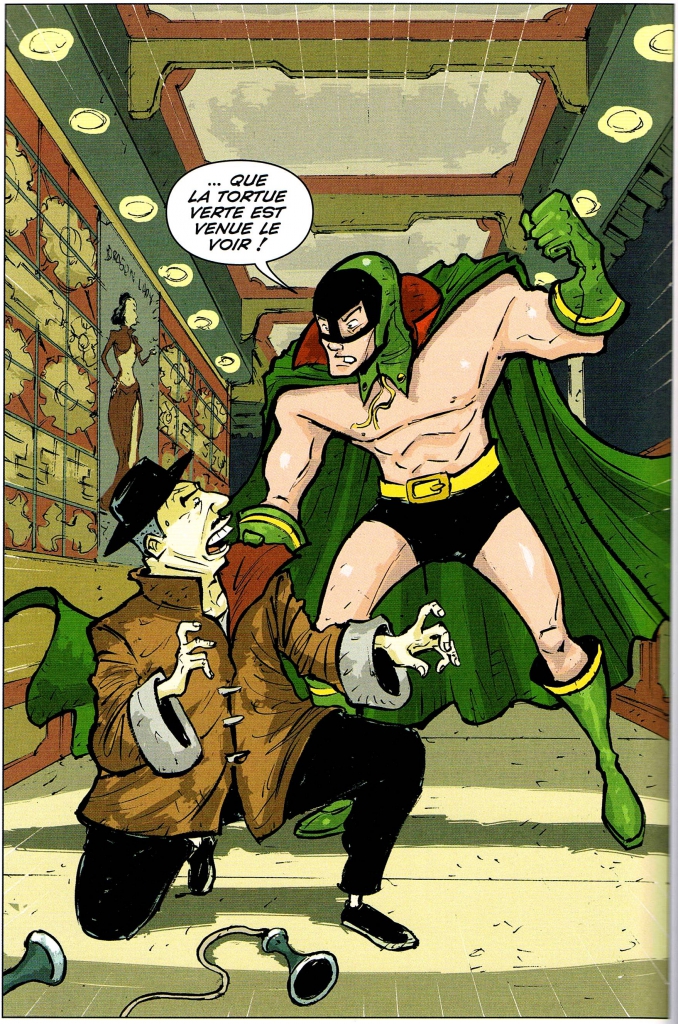 Dans les années quarante les États-Unis sont en plein âge d’or de la bande dessinée ! Les comics pullulent et tous les éditeurs inondent le marché. Un artiste chinois, Chu Hing, qui malheureusement restera inconnu, va créer le personnage du super héros « Green Turtle » pour l’un de ces éditeurs. On suppose que l’auteur rêvait d’un personnage chinois et l’éditeur d’un occidental plus conforme à l’époque ! Le comic qui racontait les aventures de ce héros (« Blazing comics ») n’eut que cinq parutions et « Green Turtle » ne montra jamais son visage… Gene Luen Yang et Sonny Liew lui rendent justice dans cet album.