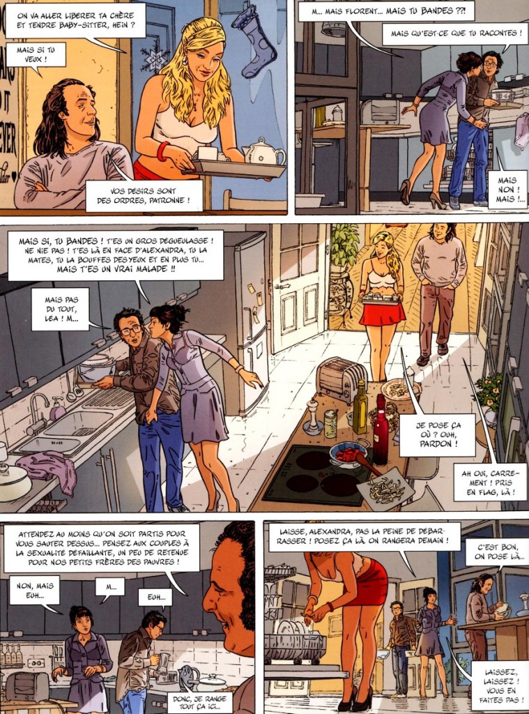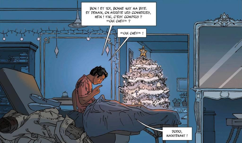 Prévu en 2 tomes, présenté sous la forme théâtrale du vaudeville, ce scénario de huis-clos tendu basé sur un malentendu explore toute l’ironie situationnelle des soirées de Noël qui virent à la catastrophe. L’action progresse au travers des dialogues, le décor reste minimaliste, les personnages de bobos parisiens débranchés en pleine débandade générationnelle se déchirent de façon conventionnelle. Cette exploration de la médiocrité sociale contemporaine a un côté jubilatoire sans pour autant tomber dans la satire féroce. L’Érection se termine par un cliffangher (coup de théâtre en français) qui laisse augurer une nuit plus interminable que prévu, un entracte en quelque sorte, en attendant la suite.