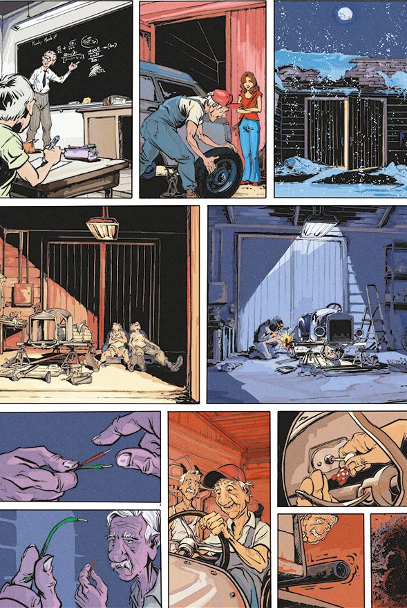 Le côté irréaliste du récit et sa fin (décevante) en mode enquête policière s’expliquerait finalement par le rêve de deux vieux fous … de vieilles bagnoles. Une case de la page 5 reprise en dernière page pourrait être la clé d’interprétation de ce road-trip qui met en scène deux joyeux retraités dont les sympathiques joutes verbales pimentent les dialogues. S’en fout la mort, suggère le doigt d’honneur de la couverture, tu ne nous auras pas. L’ensemble devient alors une belle réflexion sur la vieillesse et la façon de l’assumer. La vie est un rêve…