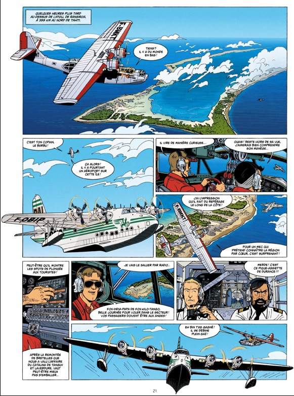 Après Le bombardier blanc, Callixte nous livre le deuxième opus des tribulations de son héros, Gilles Durance. Les nostalgiques des récits classiques d’aventures des année 60/70 style Tanguy et Laverdure (période Jijé au dessin) ou encore Buck Dany y trouveront sans doute leur compte, les allusions, citations et autre clins d’yeux émaillent le récit à leur intention. Tous les ingrédients (clichés ?) du genre étant ici recyclés : complots, enlèvements, duels de barbouzes, agents occultes défendant des confettis d’Empire, documents secrets volés, jolies filles un peu déshabillées, rivalités viriles… le tout saupoudré d’un peu de violence et de bons sentiments, on n’a pas le temps de s’ennuyer et le lecteur tourne les pages avec un plaisir nostalgique.