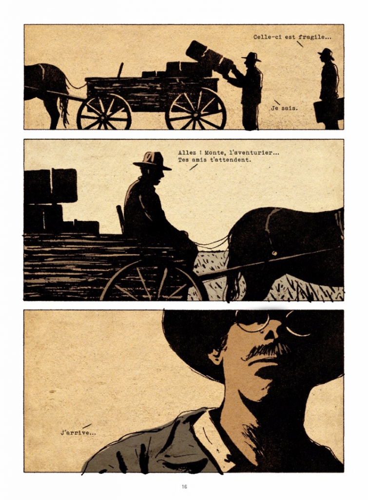 Thierry Murat est de ces auteurs qui sortent du lot. D’abord par ce que l’on voit en premier : son graphisme. Unique et identifiable entre tous, il est d’une puissance évocatrice quasi envoutante où l’épure et le contraste se font la part belle dans de grandes cases qui vous invitent à prendre votre temps. Le trait de Murat force à la contemplation et oblige le lecteur à ralentir son rythme de lecture. Il peut alors prendre à son compte le voyage initiatique du personnage et s’extraire du monde pendant la lecture des 160 pages de ce beau western intimiste. Et c’est là la deuxième marque de fabrique de Thierry Murat. Une narration fluide au service de récits intenses, des personnages profonds et authentiques qui souvent forcent l’admiration et vous font voyager hors du temps.