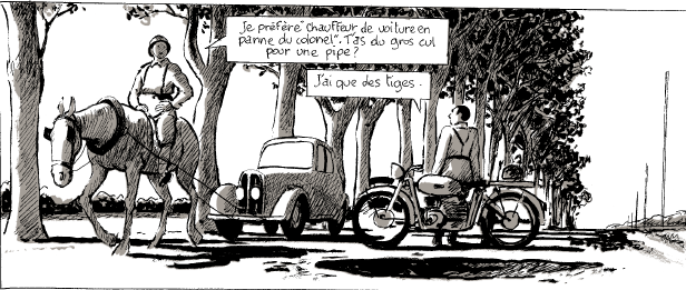 Un peu à l’instar d’un Tardi (Stalag IIb) ou d’un Olivier Speltens (l’armée de l’ombre), Pascal Rabaté base son récit sur le destin d’un simple soldat en pleine débandade de 1940. Les journées ensoleillées tranchent avec l’apprêté de la déroute française. L’auteur arrive à bien rendre l’impuissance de l’armée française face aux « boches ». On y voit aussi tout son retard « d’une guerre » avec la scène où une mule tire la voiture d’un colonel « bleu blanc rouge ». La dégelée est inévitable pour nos 2 soldats à la recherche de leur unité. Un certain fatalisme s’installe, la débrouille est de mise, on assiste aussi à des situations assez absurdes ou pathétiques et même à une scène « cochonne » (un clin d’œil à crève saucisse ?).